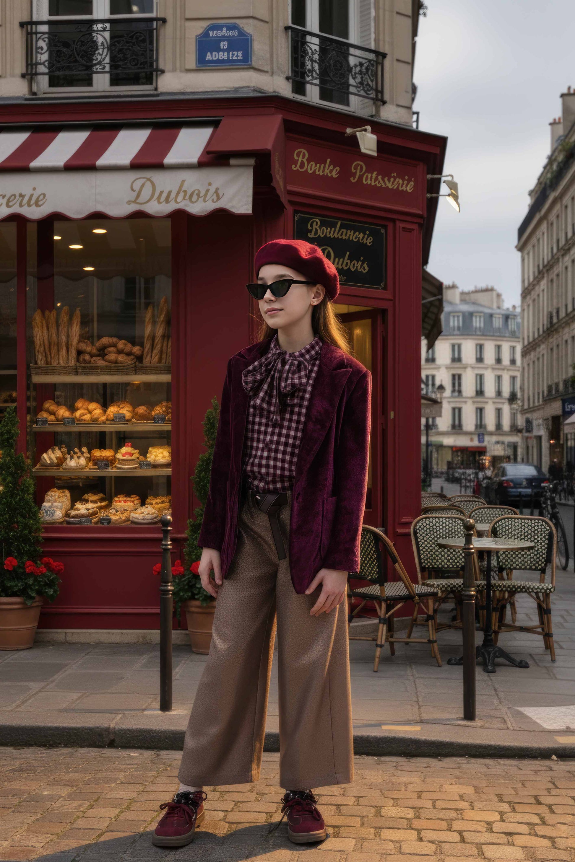 Look LuLu by Miss Grant con blazer in velluto e blusa a quadri. Eleganza urbana e dettagli raffinati per un outfit dal fascino parigino.