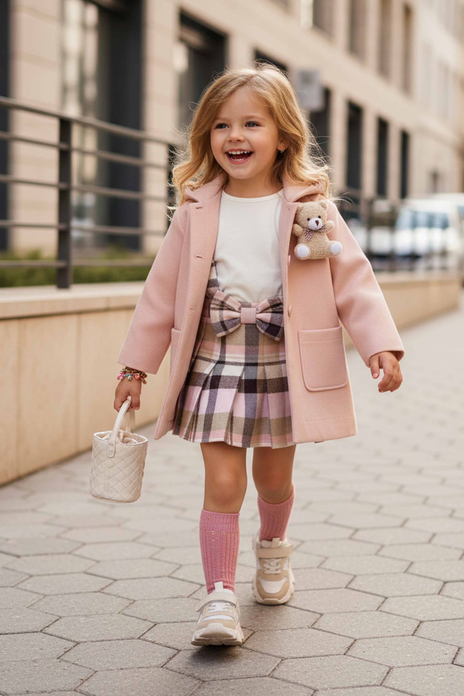 Look bambina u+è by Miss Grant con cappotto rosa e gonna a quadri. Eleganza quotidiana e dettagli iconici per piccole fashioniste.
