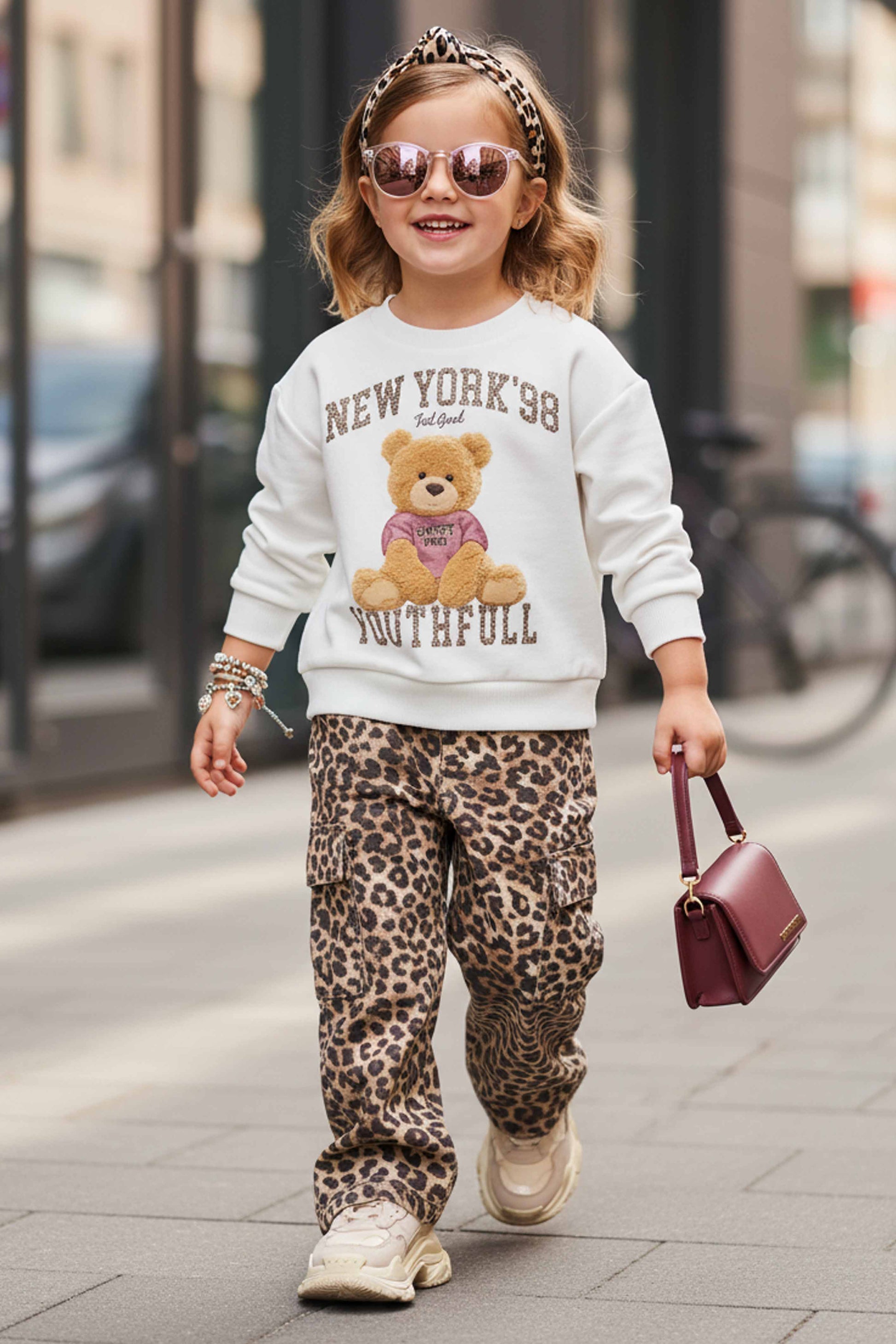 Look bambina U+È by Miss Grant con felpa orsetto e pantaloni leopardati. Stile grintoso e moderno per piccole cool girls.